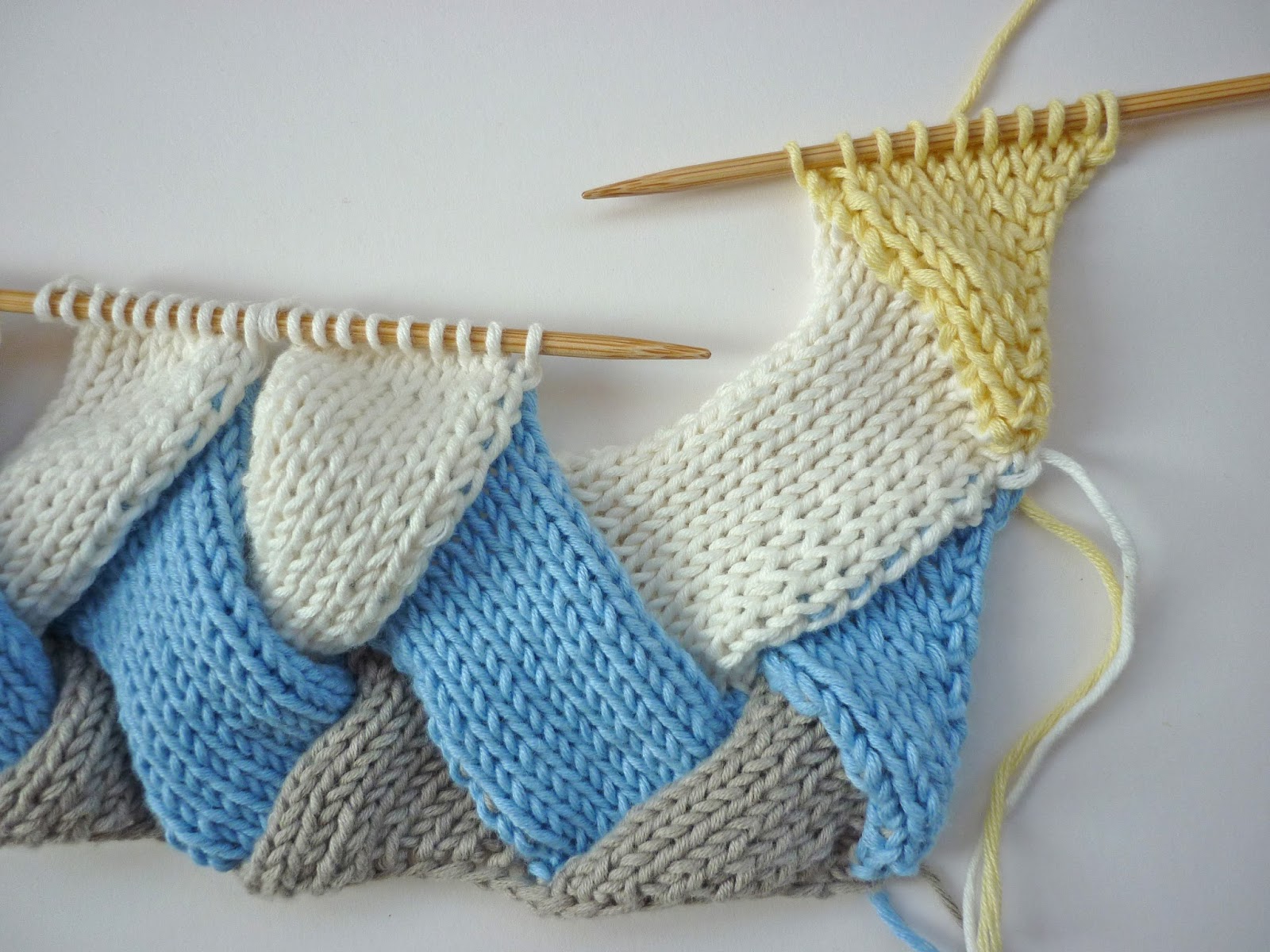 Entrelac is a really easy technique that creates a textured diamond pattern. The basketweave effect is actually created by knitting squares facing in opposite directions. Once you've got the base row of triangles sorted, you only work on a few stitches at any one time (in this case, just 10 stitches) and it is nicely repetitive, in a good sort of way, so you don't have to keep referring back to the pattern. It makes an ideal project to knit whilst watching TV.
